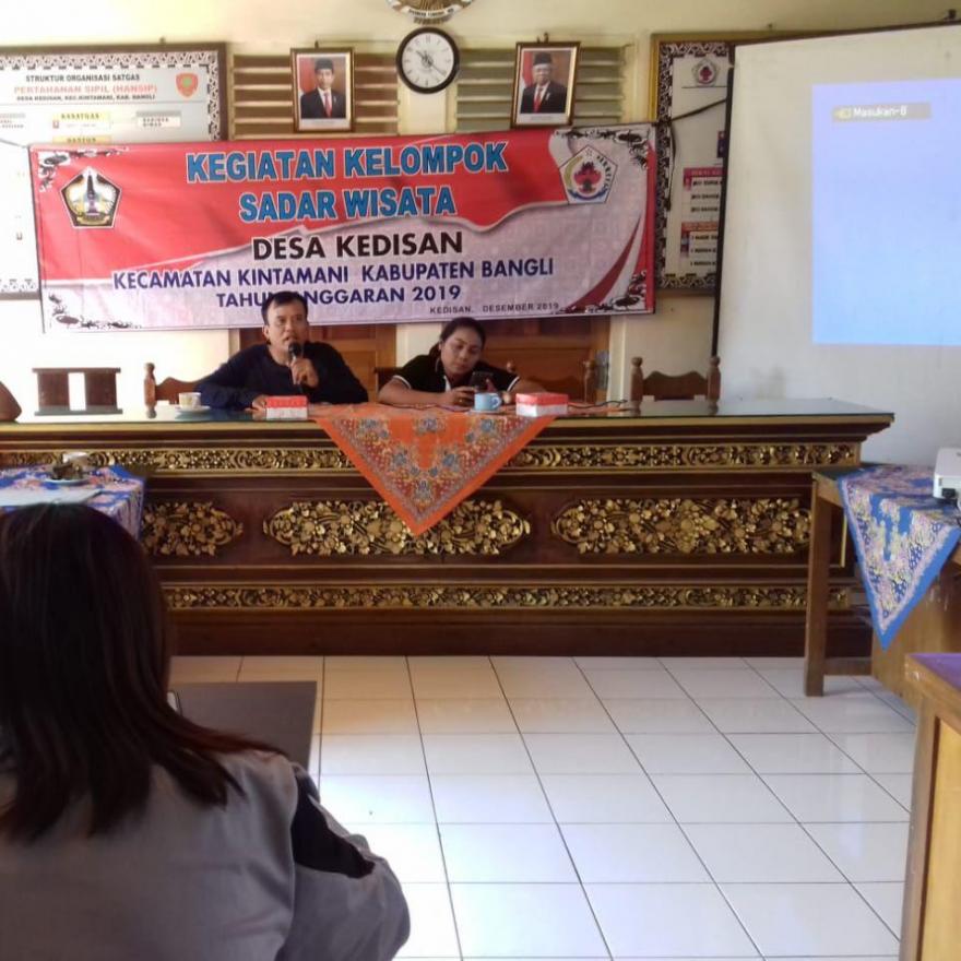 Hari ini jumat, tanggal 20 Desember 2019 di Ruang pertemuan Kantor Desa Kedisan dilaksanakannya Pelatihan tentang Sadar Wisata. Pelatihan tersebut diikuti sebanyak 50 warga setempat yang memiliki warung, kuliner, kerajinan, homestay dan kelompok sadar wisata yang biasanya juga berprofesi sebagai pemandu wisata (guide). "Para peserta pelatihan diberikan materi tentang wawasan dan pelayanan kepariwisataan yang lebih profesional,