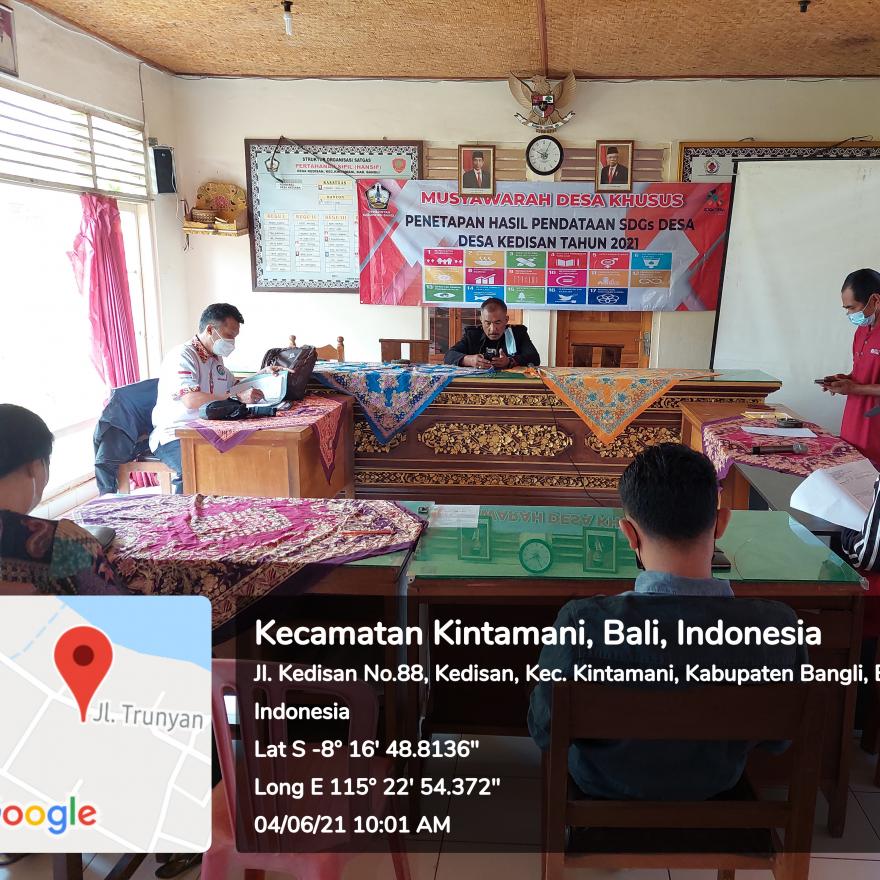 Hari ini jumat tanggal 4 Juni 2021 di Ruang Pertemuan Perbekel Kedisan bersama Pedamping Desa "Made Antara" , Perbekel Kedisan "I Nyoman Gamayana", Ketua BPD "I Wayan Ngayor" berserta anggota BPD, Ketua LPM, Babinsa, Tomas serta Perangkat Desa Kedisan melakukan Musyawarah Desa Khusus dalam Penetapan Hasil Pendataan SDGs Desa Kedisan Tahun 2021.