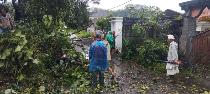 Evakuasi pohon tumbang yang menutup jalan dapat dilakukan oleh seluruh warga sekitar di jalan subak Taman Desa Kedisan Kintamani Bangli akibat cuaca buruk yakni :